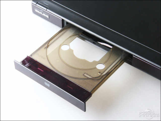 将万橸EV-DQ83接上电源开机,从弹出的碟仓来看,其采用了半透明的咖啡色塑料设计,比起全黑的碟仓设计更具时尚感。