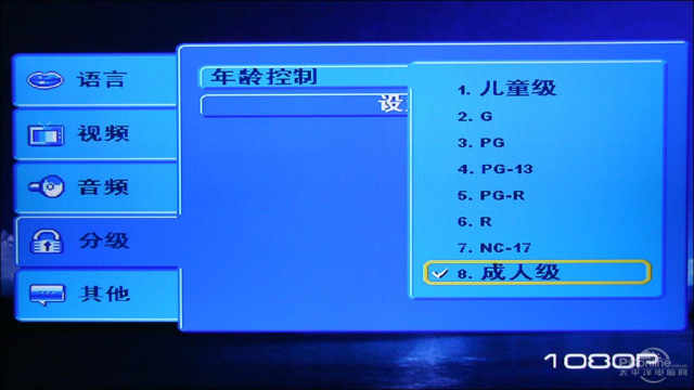 万橸EV-DQ83分级菜单中提供了年龄控制功能,其分为儿童级、PG、成人级等8个级别,可以限制相关影片的观看,但这对于国内用户的意义并不大,因为中国还没有建立这种影片分级制度。