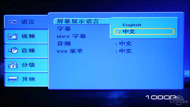 按设置键,进入播放设置界面,“”键确定,“”键退出,语言菜单包括屏幕显示语言、字幕、DivX字幕等选项,在此可以选择各自对应的语言。
