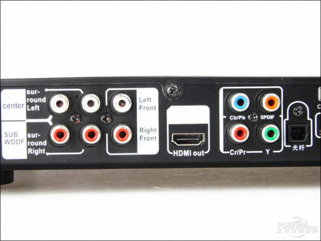 后面板的接口区配置了1组HDMI高清影音接口、1组色差分量接口、1组光纤音频输出和模拟音频6声道输出接口。