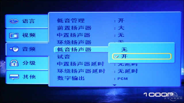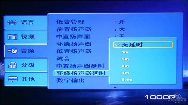 如果想使输出音效更佳,可以对前置、中置、低音等扬声器进行设置,其中中置和环绕扬声器还可以设置1-5.1秒的延时。当然,最终的效果和外置音响(如家庭影院、电视音响等)密切相关。