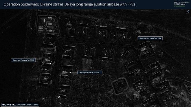 综合路透社、“战区”网站6月2日报道,雷达成像(SAR)的商业卫星图显示,俄军在伊尔库茨克别列亚基地目前确认有4架图-95轰炸机和4架图-22M3被击中损坏,摩尔曼斯克奥列尼亚基地有4架图-95和1架运输机被损坏,俄军的总损失数为13架大型飞机,其中包括8架图-95轰炸机。