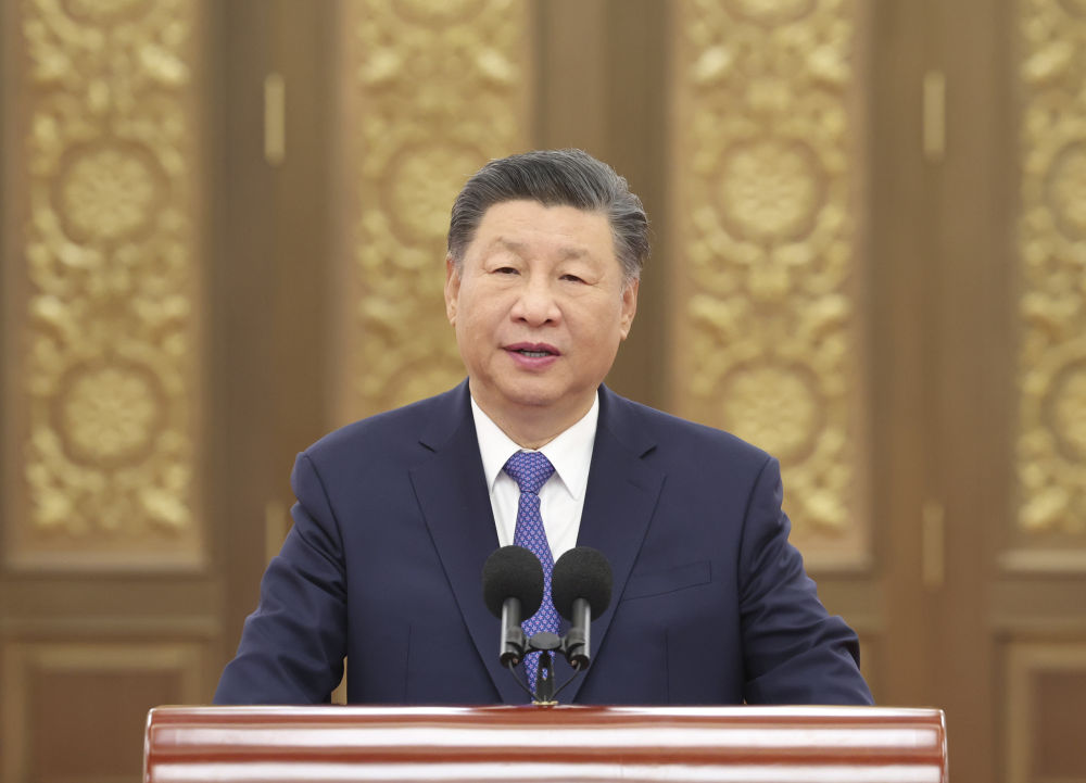 2024年9月23日,习在人民大会堂接见探月工程嫦娥六号任务参研参试人员代表并参观月球样品和探月工程成果展览。这是习发表重要讲话。新华社记者 鞠鹏 摄